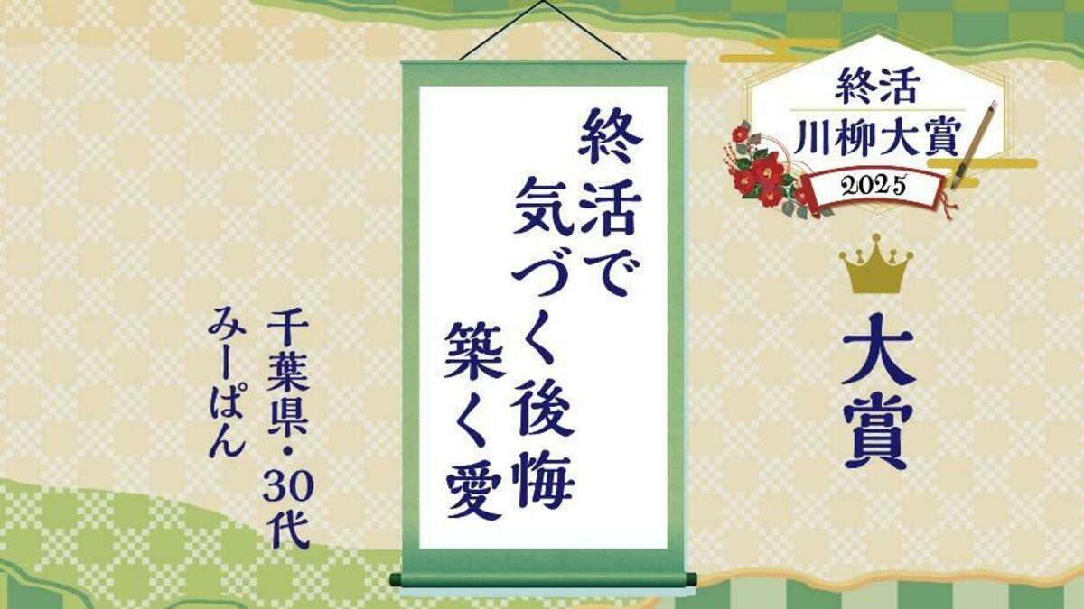 「終活川柳大賞2025」の大賞作品は「終活で 気づく後悔 築く愛」です。人生を締めくくる準備である終活を通して過去の自分の行動や考え方などの反省点に気付き、新しい愛や関係を育んでいこうとする前向きな姿勢が美しくまとめられている点が高く評価されました。