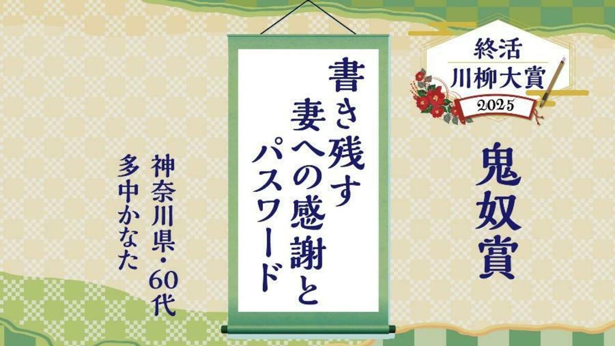 「終活川柳大賞2025」のプレゼンテーターである椿鬼奴さんが選ぶ特別賞「鬼奴賞」に輝いたのは「書き残す 妻への感謝と パスワード」です。選考理由として、近年の個人情報のデジタル化に伴うパスワード管理の重要性と、家族への気持ちがバランスよく表現されている点にあります。