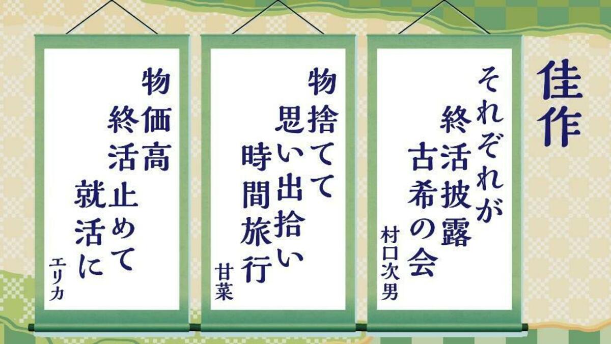 「物価高 終活止めて 就活に」は、近年の物価高に伴い、年金だけでは生活の維持が難しいことに悩むシニア世代の様子が伝わってきます。また、「終活」と「就活」を掛けたことにより、生き方の変化を強調しています。自身の「終活」を取り巻く環境が、新しい人間関係の構築や考え方の変化につながることを感じさせる作品です。