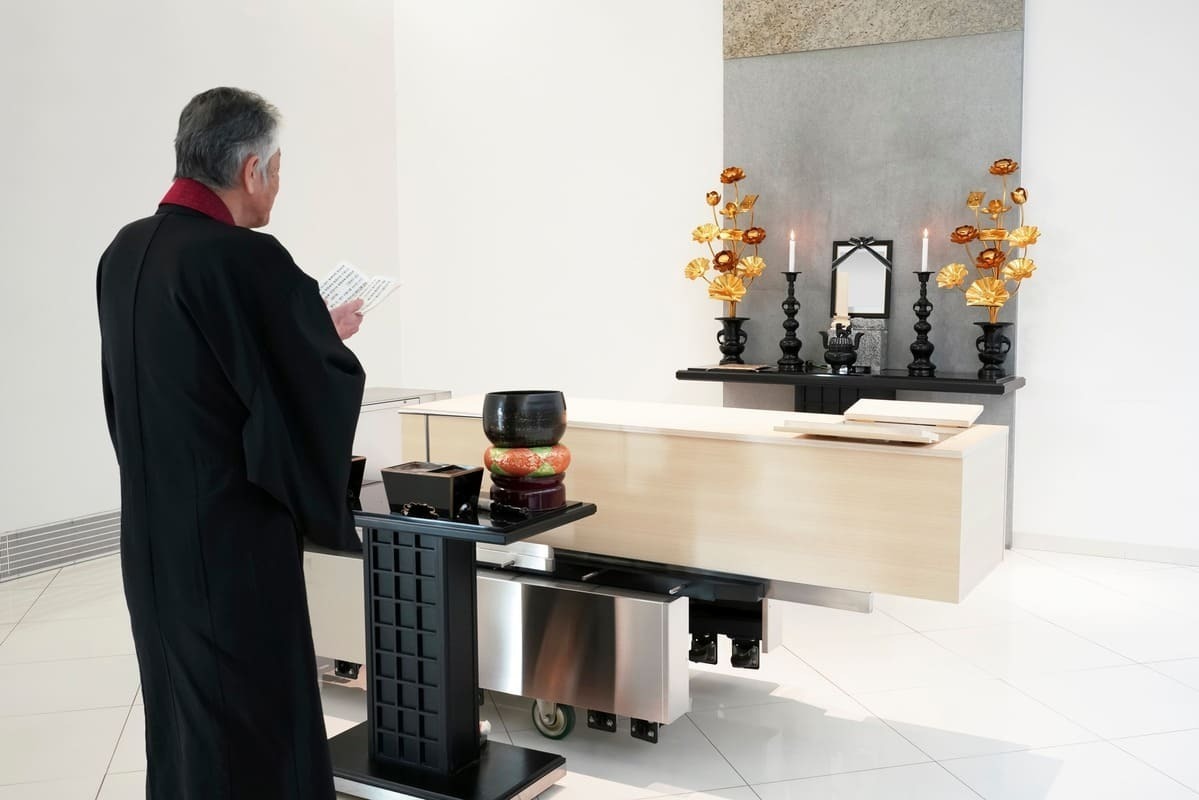 - 火葬炉の前に棺を安置し、焼香台を準備します。