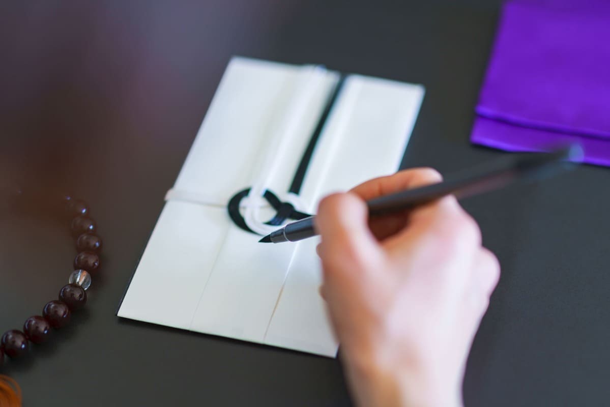 香典の表書きは、悲しみの涙で墨が薄くなったことを意味する「薄墨」を使用するのが一般的ですが、お布施は感謝の気持ちを表すものなので、薄墨にする必要はありません。濃墨の筆や筆ペンなどで記入しましょう。