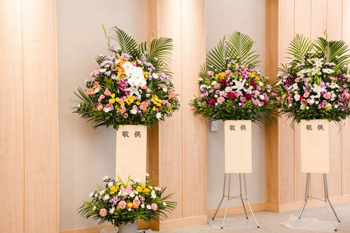 供花には贈り主が分かるように札名が付いており、葬儀会場の祭壇付近に配置されます。祭壇を挟むようにして関係の深い方から順に供花を並べるのが一般的です。ご遺族や参列者にとっては、供花を眺めることで生前の故人を偲ぶ時間を過ごせるでしょう。