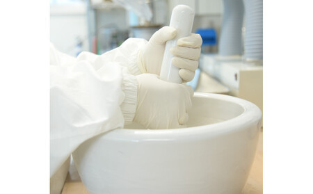 - 乳鉢に砕いた遺骨を入れ、更に細かいパウダー状にする