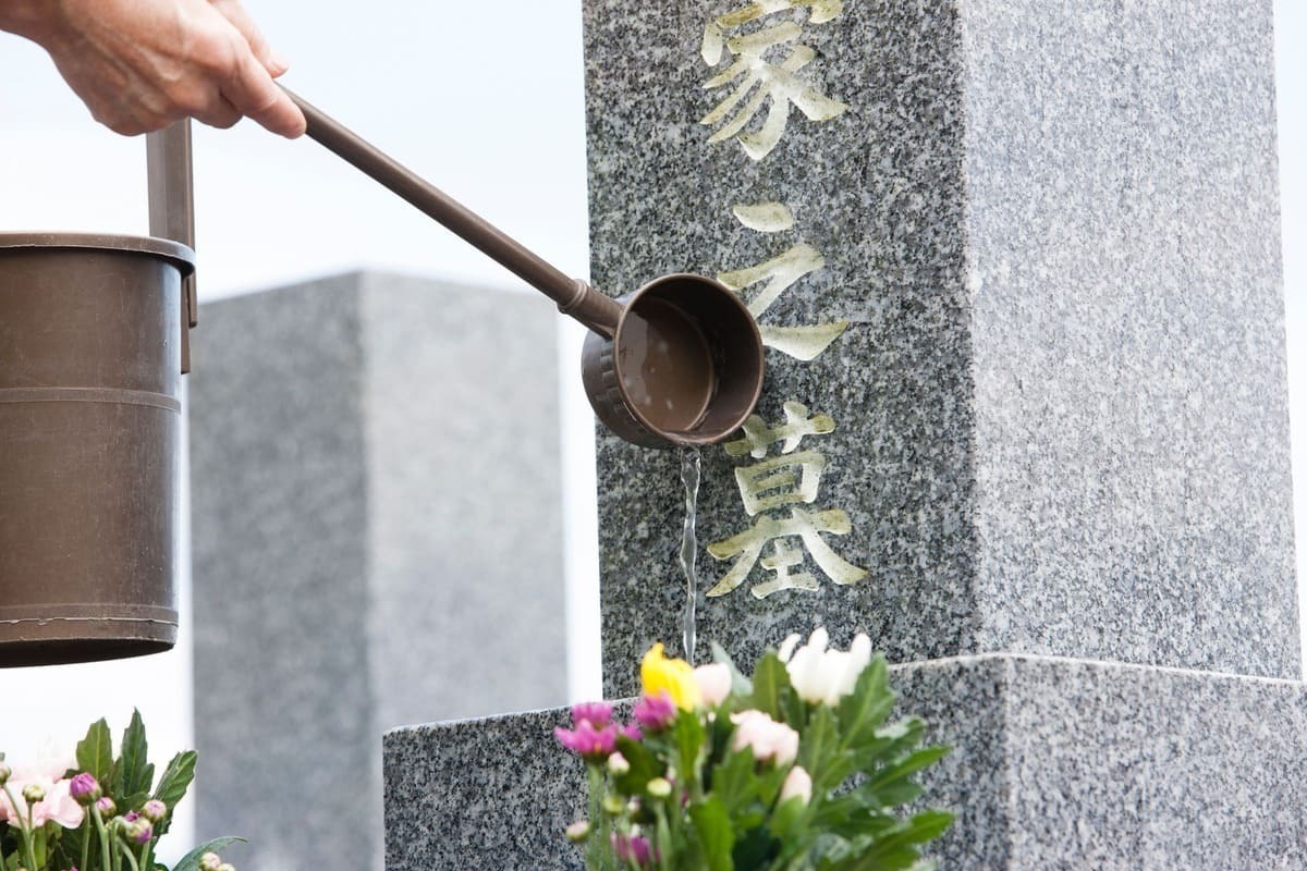 - 墓石を清めるために打ち水をする