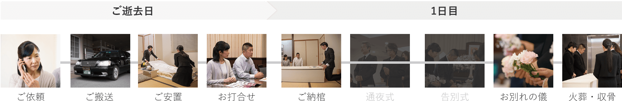 ※火葬料金はプランに含まれておらず、別途お客さまのご負担となります。火葬料金につきましてはこちらをご確認ください。※火葬場の空き状況により安置日数が延びる場合や、休憩室を利用する場合、プランに含まれないサービスをご希望の場合など、追加料金が発生することがございます。※花束・棺掛けはプランに含まれません。